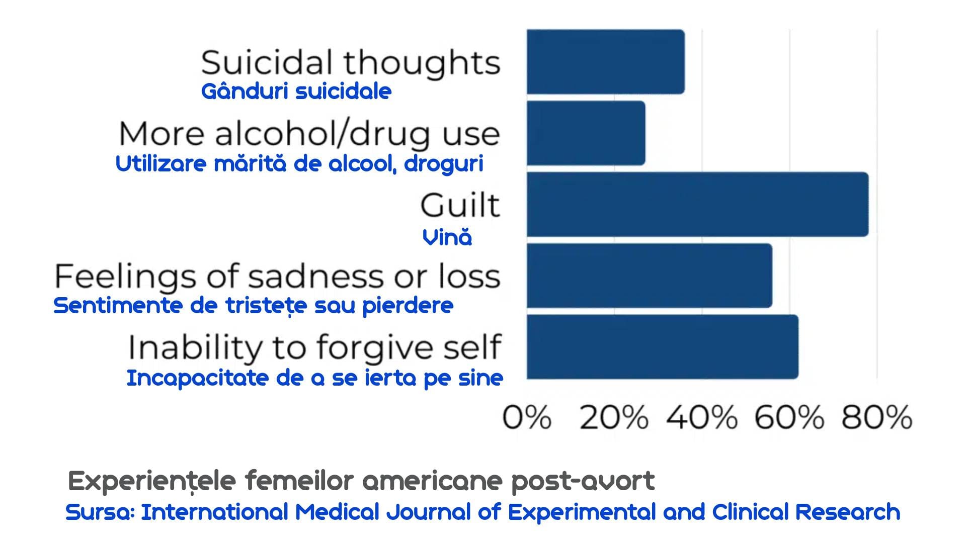 O femeie pe nume Sasha și-a explicat durerea de după avort și cum i-a afectat căsnicia: „Soțul meu a fost dezgustat de durerea mea. M-am simțit foarte respinsă și, la rândul meu, l-am respins. În toți anii în care am fost împreună, nu am putut suporta să mă atingă. Sexul a devenit un lucru josnic și dezgustător pentru mine. L-am respins mereu… Distrugerea unui copil prețios și dulce distruge complet frumusețea uniunii sexuale care a creat-o.”
